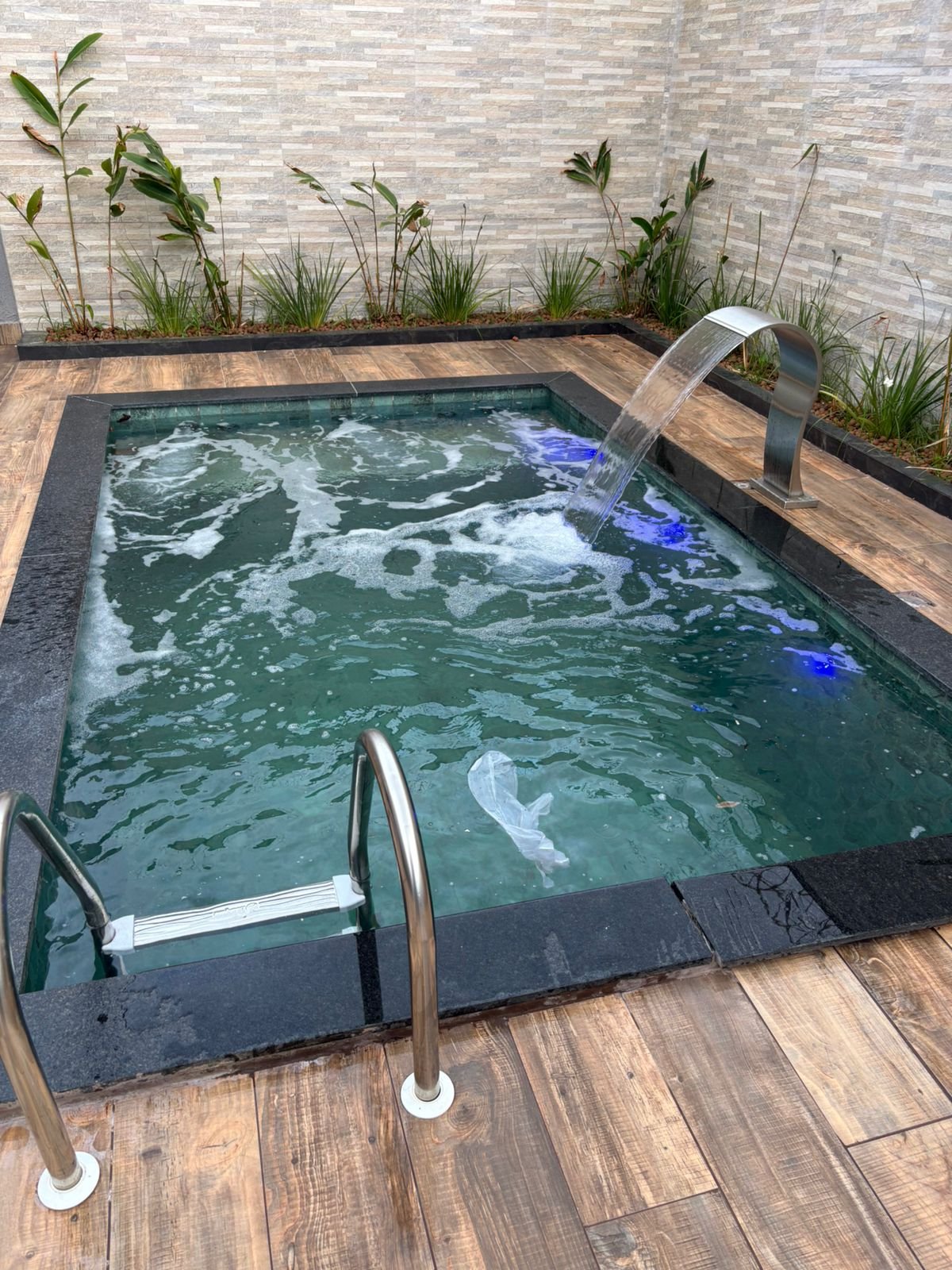 Piscina Completa: Equipada com cascata, hidromassagem e iluminação noturna (linda vista à noite).